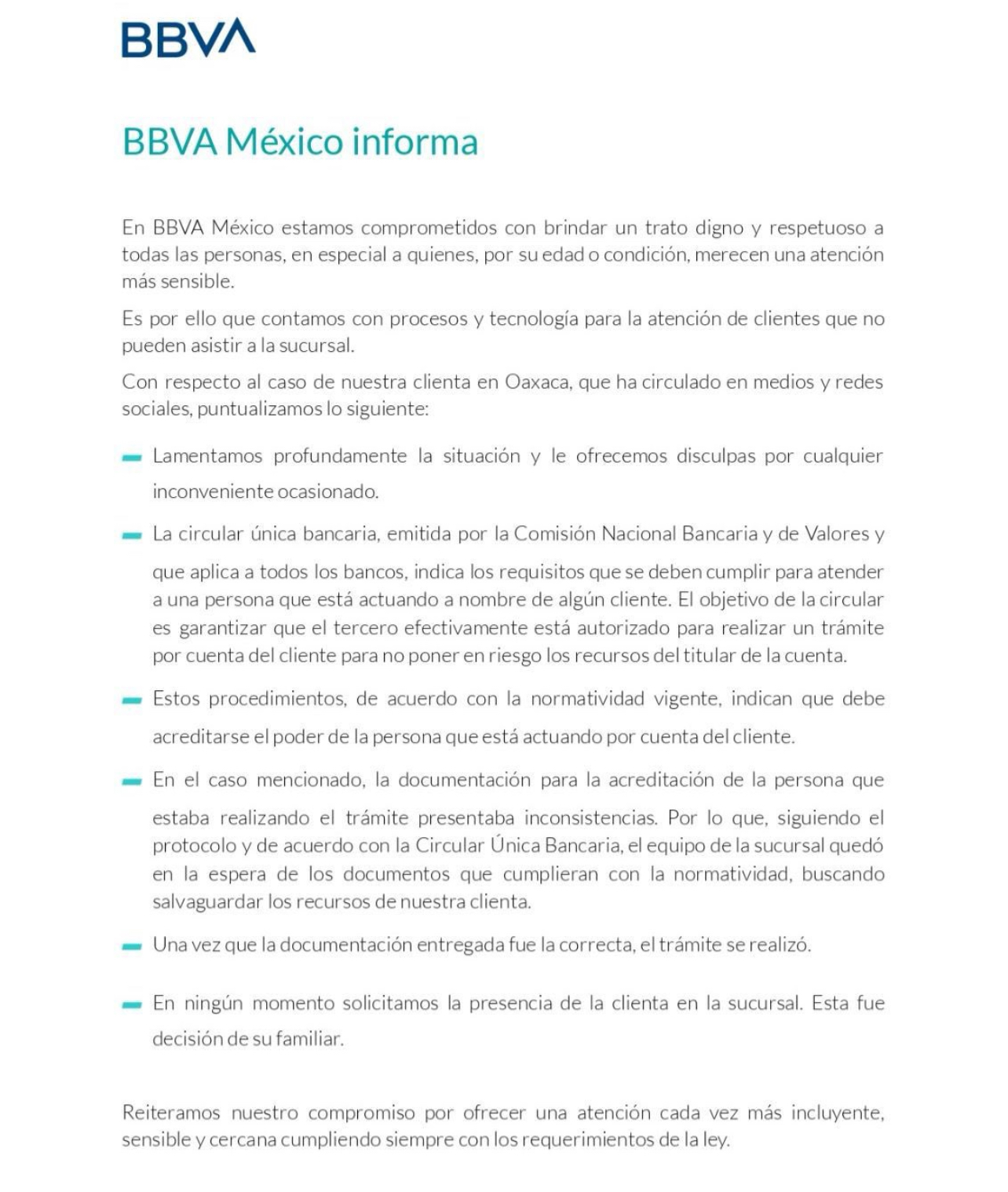 El banco emitió un comunicado oficial a través de sus redes sociales, en el que lamentó lo ocurrido y ofreció una disculpa pública a la adulta mayor. “Lamentamos profundamente la situación y le ofrecemos disculpas por cualquier inconveniente ocasionado”, expresó la institución financiera.