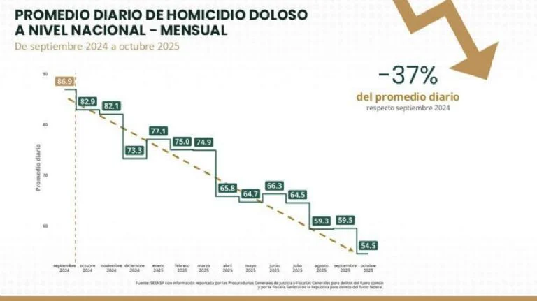 Después de presentar los datos, Marcela Figueroa, titular del SESNSP, comparó el promedio diario de asesinatos entre administraciones. Ella señaló que octubre cerró con 54.5 casos, mientras que en septiembre de 2024, último mes del gobierno anterior, se registraron 86.9. Por lo tanto, la reducción fue sustancial y marcó un cambio evidente en el comportamiento del delito.