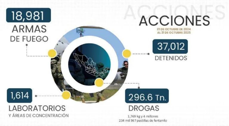 Mientras tanto, el secretario de Seguridad y Protección Ciudadana, Omar García Harfuch, informó sobre los resultados operativos en este mismo periodo. Él explicó que las corporaciones detuvieron a 37,000 personas relacionadas con delitos de alto impacto. También indicó que aseguraron casi 300 toneladas de droga y 18,981 armas de fuego, entre ellas miles de pastillas de fentanilo. De esta manera, las autoridades ampliaron la capacidad de contención en distintos estados.