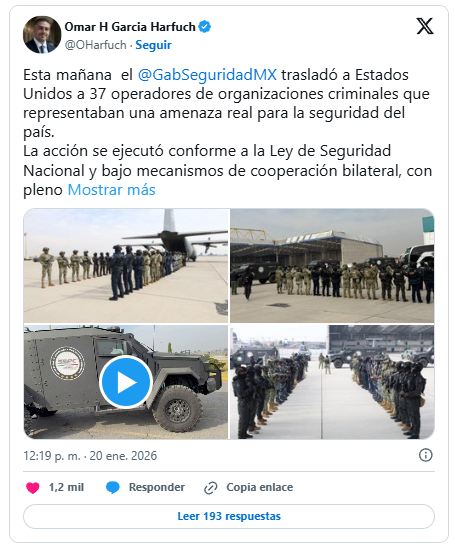 El traslado se realizó el 20 de enero bajo coordinación entre México y Estados Unidos, cumpliendo con la Ley de Seguridad Nacional y respetando la soberanía mexicana, según informó el secretario de Seguridad Ciudadana, Omar García Harfuch. Las autoridades acordaron que ninguno de los 37 reos será sentenciado a la pena de muerte en Estados Unidos.