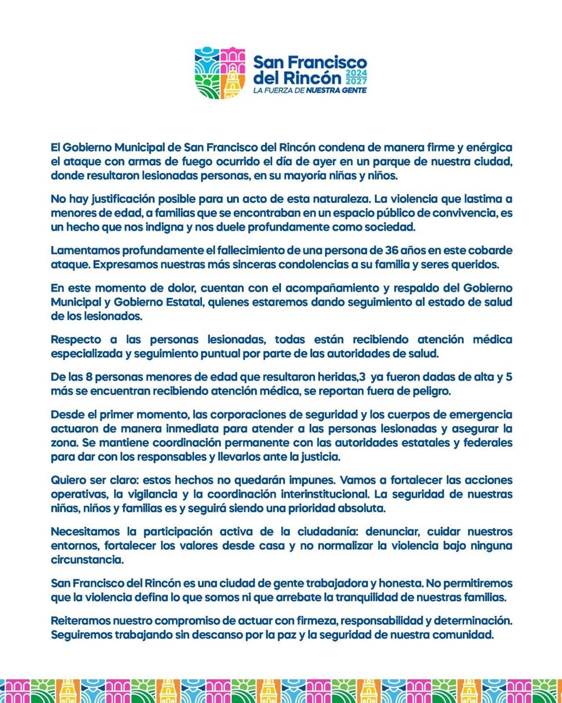 Un ataque armado en San Francisco del Rincón, Guanajuato, dejó un hombre muerto y ocho menores lesionados. El Gobierno Municipal confirmó que la víctima, de 36 años, perdió la vida por impactos de arma de fuego. El hecho generó una movilización inmediata de fuerzas federales y estatales.